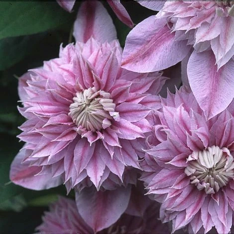 A fascinating cultivar with double, pom-pom centres set atop soft-pink outer petals with a bold cerise stripe. Plant Clematis ‘Josephine’ in full sun for the richest coloured flowers. In shadier positions, intriguing greenish blooms appear. A flamboyant variety that makes a striking specimen for walls, fences and containers! Height: 180cm (72″). Spread: 120cm (48″). Pruning Group: 2.